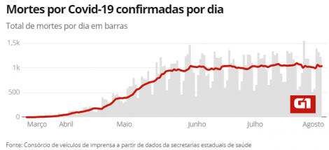 No Brasil, o número de casos de COVID-19 subiu para 2.917.562 hoje, de 2.862.761 até ontem, segundo o consórcio de veículos de imprensa a partir de dados das secretarias estaduais de Saúde. O número de mortos chegou a 98.644, de 97.418 até ontem. O número de pacientes recuperados somam 2.047.660, de 2.020.637 até ontem.