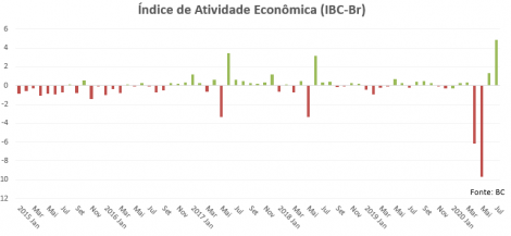 O Índice de Atividade Econômica (IBC-Br) do Banco Central (BC), considerado uma prévia do PIB oficial, subiu 4,89% em julho ante junho, após alta de 1,59% em junho, em dados ajustados. No segundo trimestre o tombo na economia foi de 10,94%, após queda de 1,5% no primeiro trimestre. No ano o IBC-Br recua 6,28%, e em 12 meses até junho, queda de 2,55%.