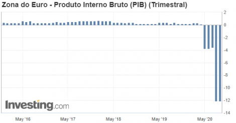 A economia da zona do euro recuou 12,1% no segundo trimestre ante o primeiro, repetindo o resultado do primeiro trimestre, segundo a Eurostat. Na comparação anual o PIB teve recuo de 15% no segundo trimestre. O emprego na zona do euro caiu 2,8% no segundo trimestre ante o primeiro, a maior queda desde que os dados começaram a ser coletados, em 1995.