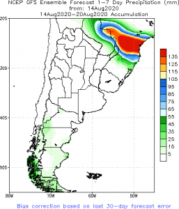 Previsão de Precipitação Argentina, 7 dias, em milímetros.