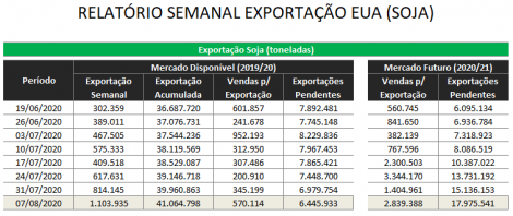 O USDA divulgou ontem o relatório de vendas semanais para exportação dos EUA, com números acima do esperado para a soja e dentro do esperado para o milho. Na semana encerrada no dia 7 de agosto, as vendas de soja 2019/20 foram de 570 mil toneladas, acumulando 47,51 milhões de toneladas na temporada, contra 48,59 milhões do mesmo período da temporada anterior. As vendas 2020/21 foram de 2,84 milhões de toneladas, acumulando 17,97 milhões de toneladas na temporada, contra 4,47 milhões do mesmo período do ano passado.
