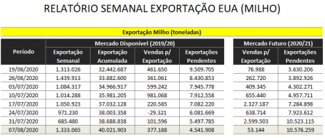 As vendas de milho 2019/20 dos EUA foram de 377 mil toneladas, acumulando 44,56 milhões de toneladas na temporada atual, contra 50,58 milhões do mesmo período de 2019. As vendas 2020/21 foram de 53 mil toneladas, acumulando 10,58 milhões de toneladas na temporada futura, ante 4,38 milhões do mesmo período de 2019.