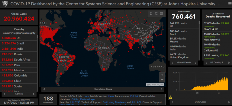 O número de mortos em todo o mundo causados pelo novo coronavírus (COVID-19) subiu para 760.461 hoje, de 750.490 até ontem, com 20.960.424 casos confirmados. Desde ontem são quase 300.000 novos casos confirmados em todo o mundo. O número de recuperados da pneumonia causada pelo vírus chegou a 12.863.984 hoje, de 12.863.984 até ontem.