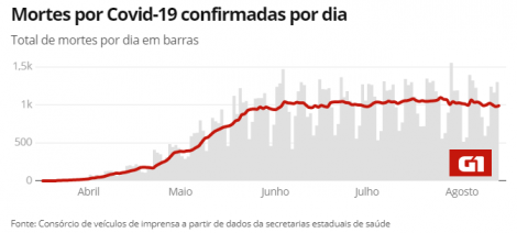 No Brasil, o número de casos de COVID-19 subiu para 3.230.436 hoje, de 3.171.374 até ontem, segundo o consórcio de veículos de imprensa a partir de dados das secretarias estaduais de Saúde. O número de mortos chegou a 105.615, de 104.342 até ontem. O número de pacientes recuperados somam 2.356.640, de 2.309.477 até ontem.