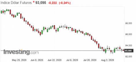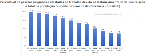 No Brasil a moeda opera com leve alta após o recuo de ontem. Ontem a moeda recuou 1,54%, a R$5,3666. Na semana de 19 a 25 de julho, 7,1% da população ocupada (5,8 milhões de pessoas), estava afastada do trabalho devido ao distanciamento social, estatisticamente estável em relação à semana anterior (7,5%) e caiu frente a primeira semana da pesquisa, de 3 a 9 de maio (19,8%), segundo o IBGE. A população desocupada foi estimada em 12,9 milhões de pessoas, estável frente a semana anterior (12,4 milhões), mas superior à da semana de 3 a 9 de maio (9,8 milhões). Com isso, a taxa de desemprego ficou em 13,7% para o período de 19 a 25 de julho, estável em relação à semana anterior (13,1%) e com alta frente a primeira semana de maio (10,5%).