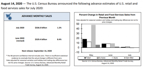 As vendas do varejo nos EUA cresceram 1,2% em julho ante junho, após crescimento de 8,4% em junho, segundo o Departamento de Comércio. O crescimento veio menor do que o esperado pelo mercado, que era de 1,9%. Excluindo automóveis, gasolina, materiais de construção e serviços de alimentação, as vendas no varejo cresceram 1,4% em julho, após alta de 6,0% em junho.