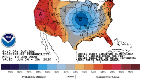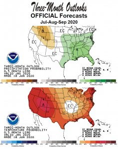 A Administração Nacional Oceânica e Atmosférica (NOAA) atualizou ontem os mapas climáticos de longo prazo, com previsão de chuvas e temperaturas de normal à acima da média no Meio-Oeste para os próximos 3 meses.