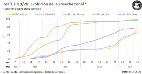A colheita de milho 2019/20 na Argentina atingiu 70,7%, com avanço semanal de 9,8 pontos percentuais. No mesmo período do ano passado a colheita estava em 44,2%. Com produtividade média de 8,57 toneladas por hectare, a estimativa de produção segue em 50 milhões de toneladas.