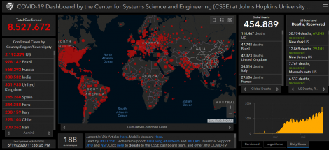 O número de mortos em todo o mundo causados pelo novo coronavírus (COVID-19) subiu para 454.889 hoje, de 450.137 até ontem, com 8.527.672 casos confirmados. Desde ontem são mais de 125.000 novos casos confirmados em todo o mundo. O número de recuperados da pneumonia causada pelo vírus chegou a 4.186.434 hoje, de 4.104.529 até ontem.