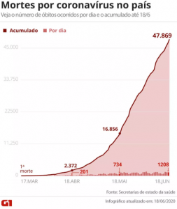 No Brasil, o número de casos de COVID-19 subiu para 984.315 hoje, de 965.512 até ontem, segundo o consórcio de veículos de imprensa a partir de dados das secretarias estaduais de Saúde. O número de mortos chegou a 47.897, de 46.842 até ontem. O número de pacientes recuperados somam 520.360, de 503.507 até ontem.