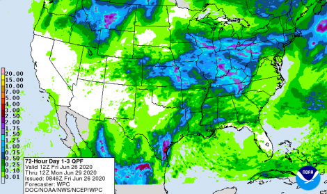 Previsão de Precipitação EUA, 72 horas, em polegadas.