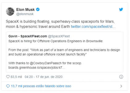 No Twitter, Elon Musk afirmou que sua empresa está construindo espaçoportos flutuantes para foguetes da categoria Super Heavy, que serão usados no lançamento da Starship em viagens a Marte, Lua e viagens hipersônicas ao redor do mundo.