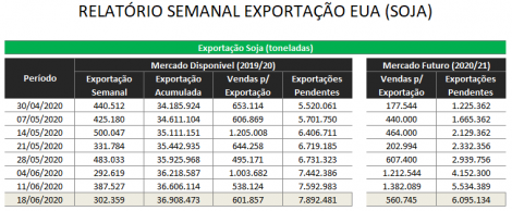 O USDA divulgou ontem o relatório de vendas semanais para exportação dos EUA, com números dentro do esperado para a soja e milho. Na semana encerrada no dia 18 de junho, as vendas de soja 2019/20 foram de 602 mil toneladas, contra 538 mil da semana anterior e 168 mil do mesmo período do ano passado. Na temporada as vendas de soja somam 44,8 milhões de toneladas, contra 47,6 milhões de toneladas do mesmo período da temporada anterior. As vendas 2020/21 foram de 561 mil tonealdas, acumulando 6,09 milhões de toneladas na temporada futura.