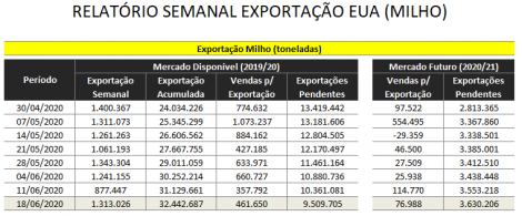 As vendas de milho 2019/20 foram de 462 mil toneladas, contra 358 mil da semana anterior e 295 mil do mesmo período de 2019. Na temporada as vendas de milho dos EUA somam 41,95 milhões de toneladas, contra 49,34 milhões do mesmo período da temporada 2018/19. As vendas futuras foram de 77 mil toneladas, acumulando 3,63 milhões de toneladas na temporada.
