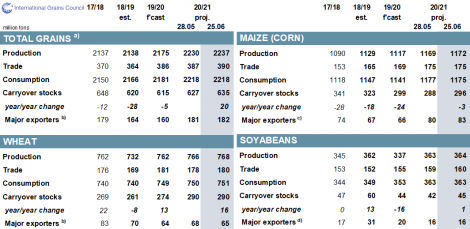 O Conselho Internacional de Grãos (IGC) elevou a estimativa de produção global de grãos 2020/21 a 2,237 bilhões de toneladas, de 2,23 bilhões da estimativa de maio e 2,175 bilhões da safra 2019/20. A produção global de soja 2020/21 deve chegar a 364 milhões de toneladas, contra 363 milhões da estimativa anterior e 337 milhões da safra anterior. A produção de milho deve chegar a 1,172 bilhão de toneladas, contra 1,169 bilhão da estimativa de maio e 1,117 bilhão da safra 2019/20.