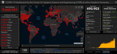 O número de mortos em todo o mundo causados pelo novo coronavírus (COVID-19) subiu para 490.904 hoje, de 484.092 até ontem, com 9.665.041 casos confirmados. Desde ontem são mais de 150.000 novos casos confirmados em todo o mundo. O número de recuperados da pneumonia causada pelo vírus chegou a 4.879.783 hoje, de 4.782.910 até ontem.