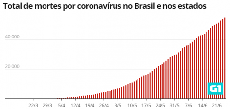 No Brasil, o número de casos de COVID-19 subiu para 1.244.419 hoje, de 1.207.721 até ontem, segundo o consórcio de veículos de imprensa a partir de dados das secretarias estaduais de Saúde. O número de mortos chegou a 55.304, de 54.434 até ontem. O número de pacientes recuperados somam 673.729, de 649.908 até ontem.
