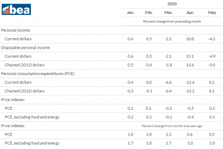 A renda pessoal nos EUA diminuiu US$ 874,2 bilhões, ou 4,2% em maio, após alta de 10,8% em abril, segundo o Departamento de Análises Econômicas (BEA). A queda veio menor do que o esperado, que era de 6%. A renda pessoal descartável (DPI) diminuiu US$ 911,1 bilhões (4,9%) e as despesas de consumo pessoal (PCE) aumentaram US$ 994,5 bilhões (8,2%). O DPI real diminuiu 5,0% em maio e o PCE real aumentou 8,1%. O índice de preços do PCE aumentou 0,1%. Excluindo alimentos e energia, o índice de preços do PCE aumentou 0,1%.