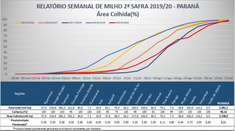 A colheita do milho 2a safra 2019/20 no Paraná está praticamente finalizada, com 98,14% colhido, segundo a SEAB/Deral. Com produtividade média de 5,11 toneladas por hectare, a estimativa de produção é de 11,66 milhões de toneladas, uma redução de 12% em relação à safra 2018/19.