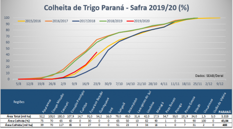 A colheita do trigo 2019/20 no Paraná atingiu 43,84%, praticamente em linha com a média dos últimos anos. A maturação atinge 57% das lavouras. Do total a ser colhido, 61% das lavouras se encontram em boas condições, 31% em condições médias e 9% em condições ruins.