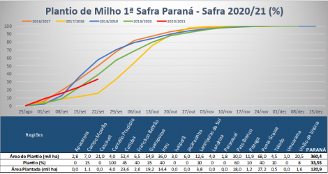 O plantio de soja 2020/21 no Paraná atingiu 0,26%, com alguns lotes semeados em Francisco Beltrão e Pato Branco. Os agricultores ainda aguardam a chegada das chuvas para darem início aos trabalhos no campo nas outras regiões do estado. Nesta safra a área de soja deve ter crescimento de 1%, para 5,54 milhões de hectares, com a produção estimada em 20,45 milhões de toneladas, contra 20,68 milhões da safra anterior. O plantio do milho 1a safra 2020/21 atingiu 33,55%, levemente atrasado em relação aos anos anteriores. Nesta safra o estado deve cultivar 360,4 mil hectares, com produção estimada em 3,46 milhões de toneladas.