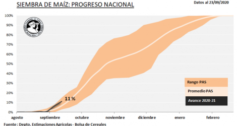 O plantio de milho 2020/21 na Argentina atingiu 11% dos 6,3 milhões de hectares projetados para esta safra, segundo a Bolsa de Cereales de Buenos Aires. Os maiores avanços concentram-se no centro da área agrícola nacional, principalmente em setores que apresentam umidade superficial adequada. Em direção às províncias de Córdoba e San Luis as obras estão atrasadas devido à falta de chuvas registrada nas últimas semanas.