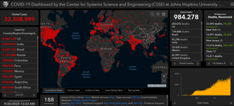 O número de mortos em todo o mundo causados pelo novo coronavírus (COVID-19) subiu para 984.278 hoje, de 977.624 até ontem, com 32.308.999 casos confirmados. Desde ontem são quase 400.000 novos casos confirmados em todo o mundo. O número de recuperados da pneumonia causada pelo vírus chegou a 22.273.789 hoje, de 22.013.874 até ontem.