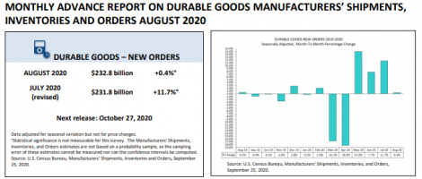 O dólar segue em alta frente a outras moedas por conta do avanço nos casos de coronavírus pelo mundo. Os pedidos de bens duráveis nos EUA cresceram 0,4% em agosto ante julho, para US$232,8 bilhões, segundo o Departamento de Comércio. Foi o quarto aumento consecutivo, após alta de 11,7% em julho. Excluindo o transporte, os novos pedidos aumentaram 0,4%. Excluindo a defesa, os novos pedidos aumentaram 0,7%. Maquinário, também com alta de quatro meses consecutivos, liderou o aumento, US$ 0,5 bilhão ou 1,5%, para US$ 31,2 bilhões.