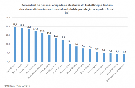 No Brasil a moeda sobe acompanhando o exterior e se aproxima dos R$5,60. Ontem a moeda recuou 1,38%, a R$5,5095. A taxa de desemprego no Brasil caiu para 13,7% no período de 30 de agosto a 05 de setembro, estatisticamente estável em relação à semana anterior (14,3%) e cresceu frente à primeira semana de maio (10,5%), segundo o IBGE. A população desocupada (13,0 milhões de pessoas) ficou estável frente à semana anterior (13,7 milhões de pessoas) e cresceu em relação à semana de 3 a 9 de maio (9,8 milhões). Cerca de 3,4 milhões (ou 4,2% da população ocupada) estavam afastados do trabalho devido ao distanciamento social. Esse contingente ficou estatisticamente estável frente à semana anterior (3,6 milhões ou 4,4%), mas caiu frente à semana de 3 a 9 de maio (16,6 milhões ou 19,8% dos ocupados).