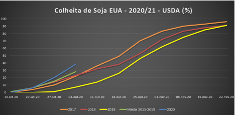 A colheita de soja 2020/21 nos EUA atingiu 38%, contra 12% do mesmo período de 2019 e 28% da média dos últimos 5 anos, segundo o USDA. As condições das lavouras ficaram estáveis em 64% boas/excelentes, contra 54% do mesmo período do ano passado.