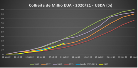 A colheita de milho 2020/21 nos EUA atingiu 25%, contra 14% de 2019 e 24% da média. As condições das lavouras tiveram melhora de 1 ponto percentual durante a última semana, para 62% boas/excelentes, contra 56% do mesmo período de 2019.