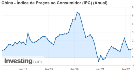 A inflação ao consumidor da China medido pelo índice de preços ao consumidor (CPI) subiu 0,6% em fevereiro ante janeiro, após alta de 0,4% em janeiro. Na comparação anual o CPI ficou estável em 0,9%. Já a inflação ao produtor da China subiu 8,8% em fevereiro na comparação anual, desacelerando da alta de 9,1% observada em janeiro.