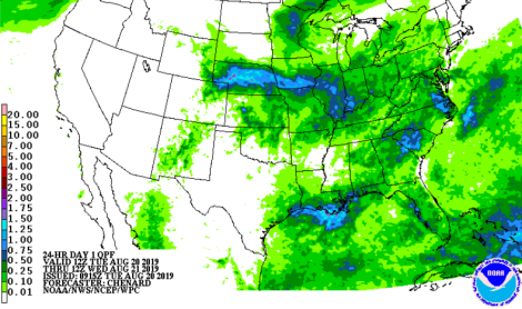 Nos EUA, tempo chuvoso no Meio-Oeste hoje.