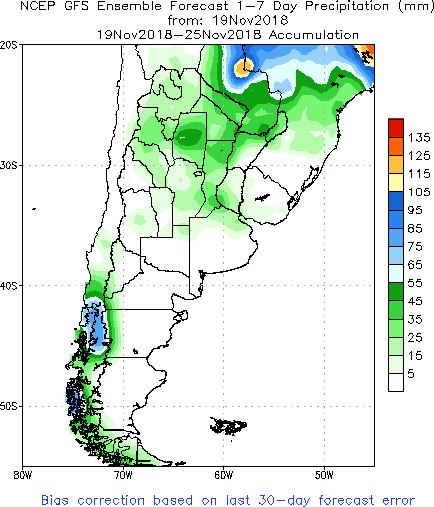 Previsão de Precipitação Argentina, 7 dias, em milímetros.