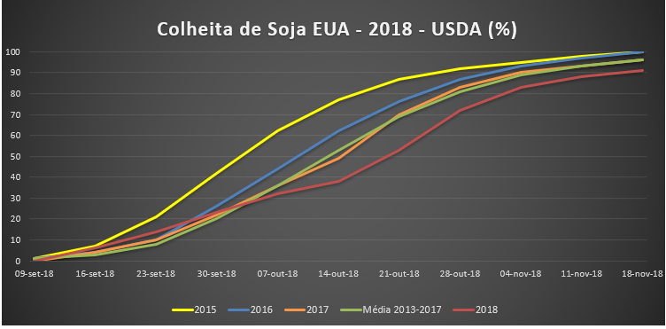 A colheita de soja nos EUA desacelerou na última semana, avançando apenas 3 pontos percentuais, para 91% colhido, contra 96% do mesmo período de 2017 e da média dos últimos 5 anos, segundo o USDA.