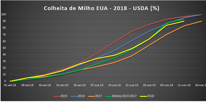 A colheita de milho nos EUA avançou 6 pontos percentuais na última semana, para 90% colhido, contra 89% de 2017 e 93% da média dos últimos 5 anos.