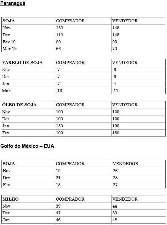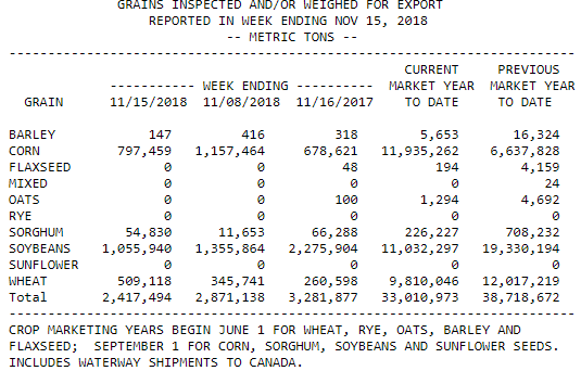 O USDA divulgou ontem o relatório de embarques semanais de grãos dos EUA, com números dentro do esperado para a soja e milho. Na semana encerrada no dia 15 de novembro, os embarques de soja foram de 1,055 milhão de toneladas, contra 1,356 milhão da semana anterior e 2,276 milhões do mesmo período do ano passado. Na temporada, os embarques de soja somam 11,03 milhões de toneladas, contra 19,33 milhões do mesmo período da temporada anterior. Os embarques de milho foram de 797 mil toneladas, contra 1,157 milhão da semana anterior e 679 mil do mesmo período de 2017. Na temporada, os embarques de milho somam 11,93 milhões de toneladas, contra 6,64 milhões do mesmo período de 2017.