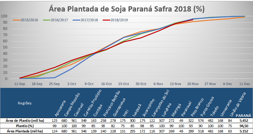 O plantio de soja no Paraná está na reta final, com 94,5% semeado, em linha com os anos anteriores, segundo a SEAB/Deral. As lavouras estão com 97% em boas condições, com 75% em desenvolvimento vegetativo, 14% em floração e 3% em enchimento de grãos.