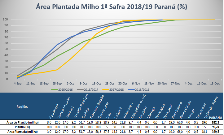 O plantio do milho 1a safra no Paraná está praticamente finalizada, com 99,24% semeado dos 352 mil hectares projetados para esta safra. As lavouras estão com 96% em boas condições, com 86% em desenvolvimento vegetativo, 12% em floração e 1% em enchimento de grãos.
