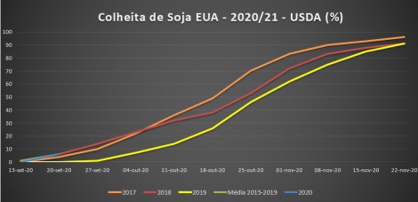 A colheita de soja 2020/21 dos EUA atingiu 6%, contra 2% do mesmo período de 2019 e 6% da média dos últimos 5 anos, segundo o USDA. As lavouras permaneceram com 63% em boas condições, contra 54% do mesmo período do ano passado.