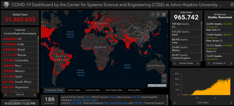 O número de mortos em todo o mundo causados pelo novo coronavírus (COVID-19) subiu para 965.742 hoje, de 961.459 até ontem, com 31.365.633 casos confirmados. Desde ontem são 250.000 novos casos confirmados em todo o mundo. O número de recuperados da pneumonia causada pelo vírus chegou a 21.282.646 hoje, de 21.531.728 até ontem.