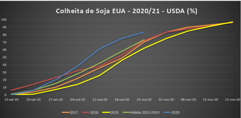 A colheita de soja 2020/21 nos EUA atingiu 83%, contra 57% do mesmo período de 2019 e 73% da média dos últimos 5 anos, segundo o USDA.