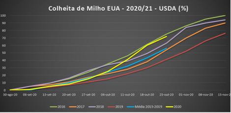 A colheita de milho 2020/21 nos EUA atingiu 72%, contra 38% de 2019 e 56% média.