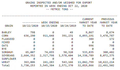 Os embarques semanais de soja dos EUA foram de 2,66 milhões de toneladas na semana encerrada no dia 22 de outubro, contra 2,32 milhões da semana anterior e 1,58 milhão do mesmo período do ano passado, segundo o USDA. Na temporada 2020/21 os embarques de soja somam 14,34 milhões de toneladas, contra 8,07 milhões do mesmo período da temporada anterior. Os embarques de milho foram de 636 mil toneladas, contra 912 mil da semana anterior e 391 mil de 2019. Na temporada os embarques de milho dos EUA somam 6,09 milhões de toneladas, contra 3,48 milhões do mesmo período da temporada 2019/20.