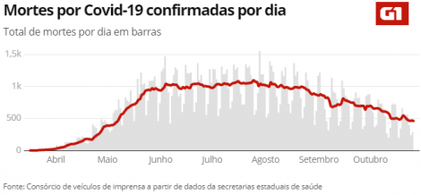 No Brasil, o número de casos de COVID-19 subiu para 5.411.550 hoje, de 5.394.128 até ontem, segundo o consórcio de veículos de imprensa a partir de dados das secretarias estaduais de Saúde. O número de mortos chegou a 157.451, de 157.163 até ontem. O número de pacientes recuperados somam 4.865.930, de 4.835.915 até ontem.