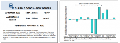 Os pedidos de bens duráveis nos EUA cresceram 1,9% em setembro ante agosto, para US$ 237,1 bilhões, após alta de 0,4%, segundo o Departamento de Comércio. Excluindo transportes, os novos pedidos aumentaram 0,8%. Excluindo defesa, os novos pedidos aumentaram 3,4%. Equipamentos de transporte, um aumento em quatro dos últimos cinco meses, liderou o aumento, US$ 3,0 bilhões ou 4,1%, para US$ 76,8 bilhões.