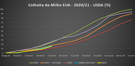 A colheita de milho 2020/21 nos EUA atingiu 15%, contra 10% de 2019 e 16% da média. A maturação atinge 75% das lavouras, contra 39% de 2019 e 65% da média. As condições das lavouras permaneceram estáveis com 61% boas/excelentes, ante 57% do ano anterior.