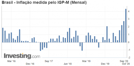 No Brasil a moeda recua realizando as altas recentes. Ontem a moeda subiu 1,42%, a R$5,6358, no maior valor em 4 meses. O governo anunciou ontem a criação do programa Renda Cidadã, o novo programa social do governo para substituir o Bolsa Família. Segundo o senador Marcio Bittar (MDB-AC), relator da PEC Emergencial onde será incluído o Renda Cidadã, o programa seria bancado com recursos do Fundeb e com verbas reservadas no Orçamento para pagamentos de precatórios, que são dívidas do governo já reconhecidas pela Justiça. A Ordem dos Advogados do Brasil (OAB) divulgou parecer ontem em que classifica como inconstitucional usar recursos de precatórios para financiar o novo programa social. Após a repercussão negativa, agora o governo discute abandonar rolagem de precatórios e encontrar outra maneira de custear o programa. A inflação do Brasil medida pelo Índice Geral de Preços-Mercado (IGP-M) subiu 4,34% em setembro ante agosto, após alta de 2,74% em agosto, segundo a Fundação Getulio Vargas (FGV). Dentre os índices que compõe o IGP-M, o Índice de Preços ao Produtor Amplo (IPA) subiu 5,92%, o Índice de Preços ao Consumidor (IPC) subiu 0,64% e o Índice Nacional de Custo de Construção (INCC) teve alta de 1,15%.