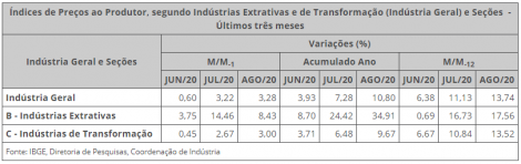 A inflação à indústria brasileira medida pelo Índice de Preços ao Produtor (IPP) subiu 3,28% em agosto ante julho, a maior variação positiva da série, iniciada em janeiro de 2014, segundo o IBGE. O acumulado no ano atingiu 10,80%. Frente a agosto de 2019, a variação de preços foi de 13,74%. Em agosto, os preços das 24 atividades tiveram variações positivas, contra 20 no mês anterior. As quatro maiores variações foram nas indústrias extrativas (8,43%), refino de petróleo e produtos de álcool (6,24%), outros produtos químicos (4,13%) e alimentos (4,07%). Os setores de maior influência foram: alimentos (1,00 p.p.), refino de petróleo e produtos de álcool (0,52 p.p.), indústrias extrativas (0,44 p.p.) e outros produtos químicos (0,32 p.p.).